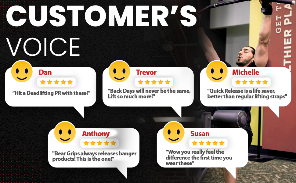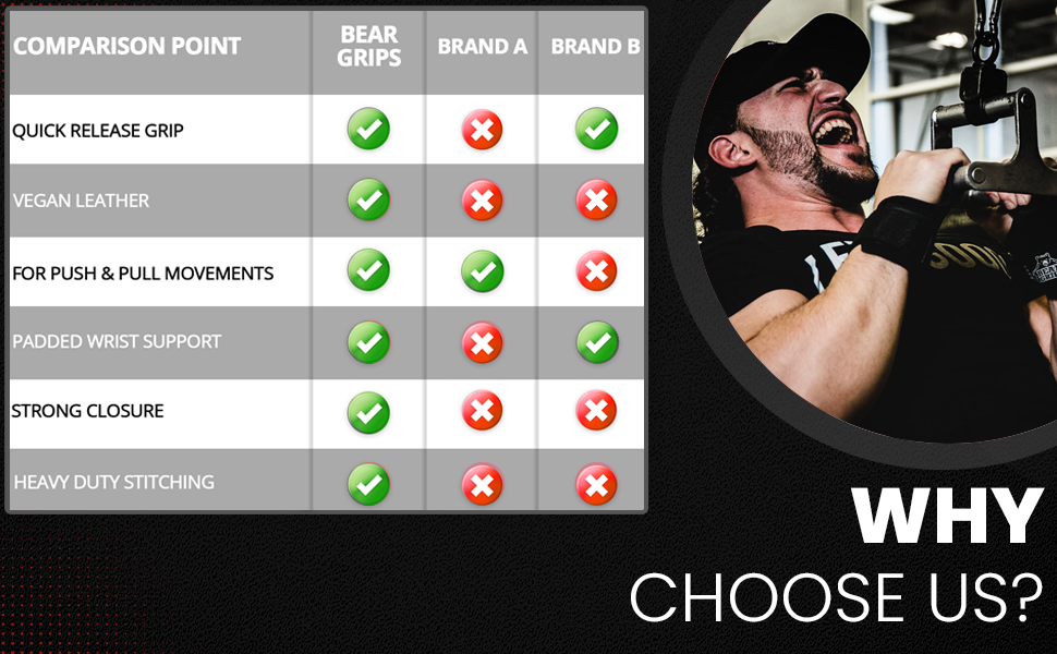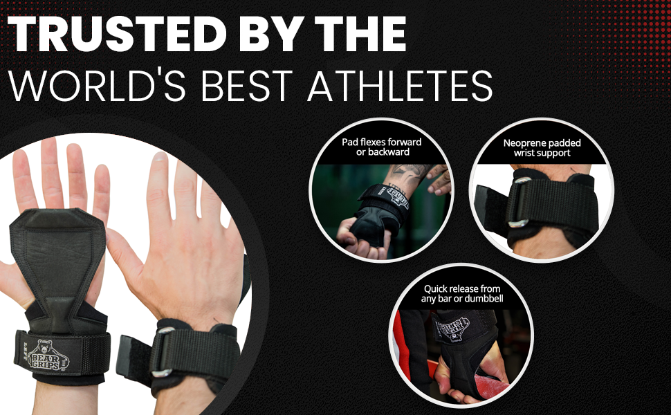 Traditional lifting straps: The biggest issue with traditional wrist straps for weightlifting Is you have to wrap a long tail of the wrist straps around a bar or barbell, and now you are stuck to that bar. If you ever want to bail out of a lift, you can't with traditional gym straps. Bear Grips may help solve this by allowing you to use their quick release pad to hold the bar securely, or bail out if needed.